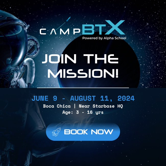 Ready to explore outer space? Join us at Alpha Space Camp BTX in Boca Chica, Texas, near Starbase HQ, for an interstellar adventure from June 9 to August 11, 2024. This camp invites kids to navigate the mysteries of space and learn about our universe through hands-on experiments, simulations, and interactive learning sessions. Designed to inspire, educate, and entertain, it provides your child with a rock-solid set of skills, fantastic friends, and memories that last a lifetime. Overnight Camp for ages 9-16 offers full days and nights at $2999/week.